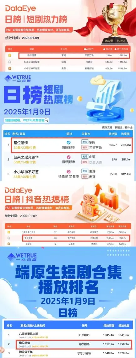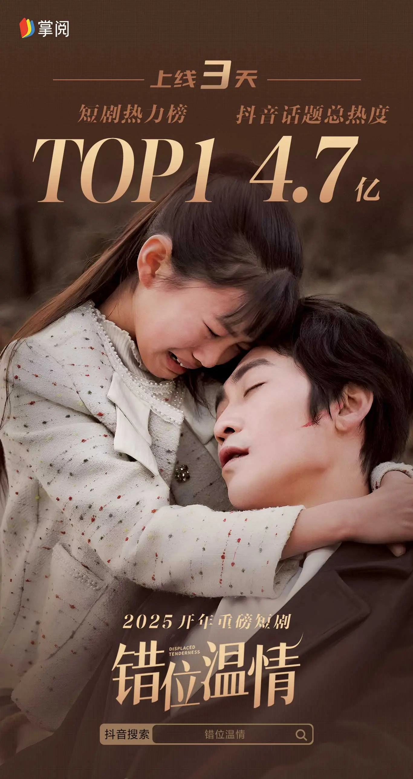 1月10日消息,掌阅出品的短剧《错位温情》上线后热度攀升,在多个榜单中表现亮眼,在昨日的短剧热度排名中,不仅登顶DateEye短剧热力榜、WETRUE短剧热度榜,还分别在两平台的短剧端原生热播榜、端原生播放榜中位列第二。凭借紧凑的剧情和深刻的情感表达,《错位温情》迅速成为观众讨论的焦点,上线仅3天,抖音话题总热度已突破4.7亿,目前讨论热度仍在持续高涨。